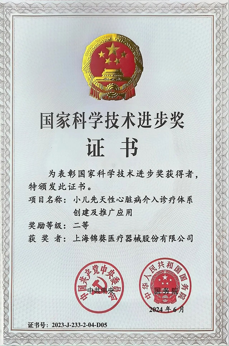 6月24日,全國科技大會、國家科學(xué)技術(shù)獎勵大會、兩院院士大會在京召開。會上公布了2023年度國家科學(xué)技術(shù)獎獲獎名單。其中,創(chuàng)投集團(tuán)被投企業(yè)上海錦葵醫(yī)療器械股份有限公司(以下簡稱“錦葵醫(yī)療”)參與完成的“小兒先天性心臟病介入診療體系創(chuàng)建及推廣應(yīng)用”項目榮獲國家科學(xué)技術(shù)進(jìn)步獎二等獎!