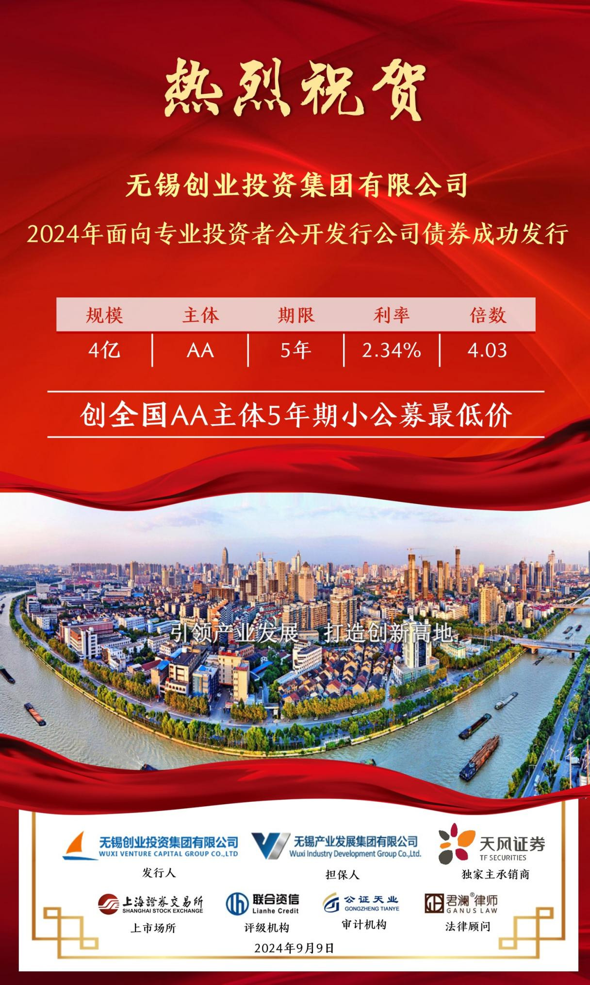 9月9日,無錫創(chuàng)業(yè)投資集團有限公司(簡稱“無錫創(chuàng)投集團”)2024年面向?qū)I(yè)投資者公開發(fā)行公司債券“24錫創(chuàng)01”成功發(fā)行,發(fā)行規(guī)模4億元,發(fā)行期限5年,認(rèn)購倍數(shù)4.03倍,票面利率2.34%,創(chuàng)全國可比債券歷史發(fā)行最低利率!本期債券由天風(fēng)證券承銷,主體評級AA,債項評級AAA。 無錫創(chuàng)投集團作為無錫產(chǎn)業(yè)集團旗下的創(chuàng)業(yè)投資和股權(quán)投資平臺,近年來在集團的正確領(lǐng)導(dǎo)和大力支持下,圍繞無錫“465”現(xiàn)代化產(chǎn)業(yè)集群建設(shè),聚焦產(chǎn)業(yè)集團“1+4+X”產(chǎn)業(yè)布局,持續(xù)深化產(chǎn)融協(xié)同合作,不斷提升資金使用效率,努力為公司高質(zhì)量發(fā)展提供更低成本、更長周期、更加靈活的資金支持。未來,公司將繼續(xù)承擔(dān)國企社會責(zé)任,勇挑重擔(dān),發(fā)揮自身優(yōu)勢,持續(xù)為無錫新質(zhì)生產(chǎn)力和實體經(jīng)濟高質(zhì)量發(fā)展注入新活力、增添新動能。 |